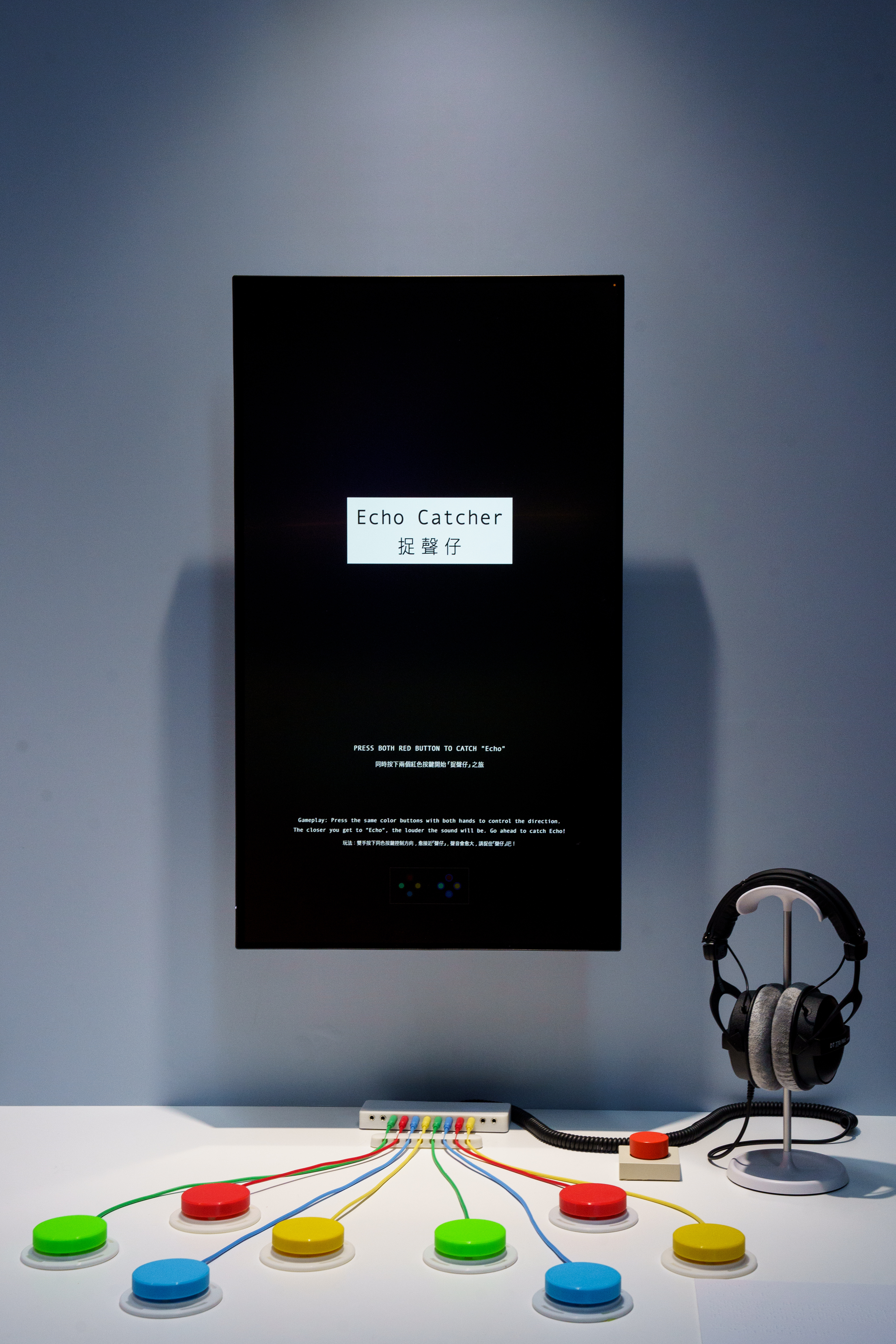 At the start of the activity, participants will wear headphones, and they will hear various sounds emitted by hidden audio sources, immersing them in a rich auditory environment. Participants need to place their hands on the controllers in front of them and fully rely on the sounds to guide them in capturing the main character, "Echo." Throughout this process, they will hear footsteps, ambient sounds, and the murmurs of "Echo," and they will encounter obstacles that may hinder their ability to successfully catch "Echo."