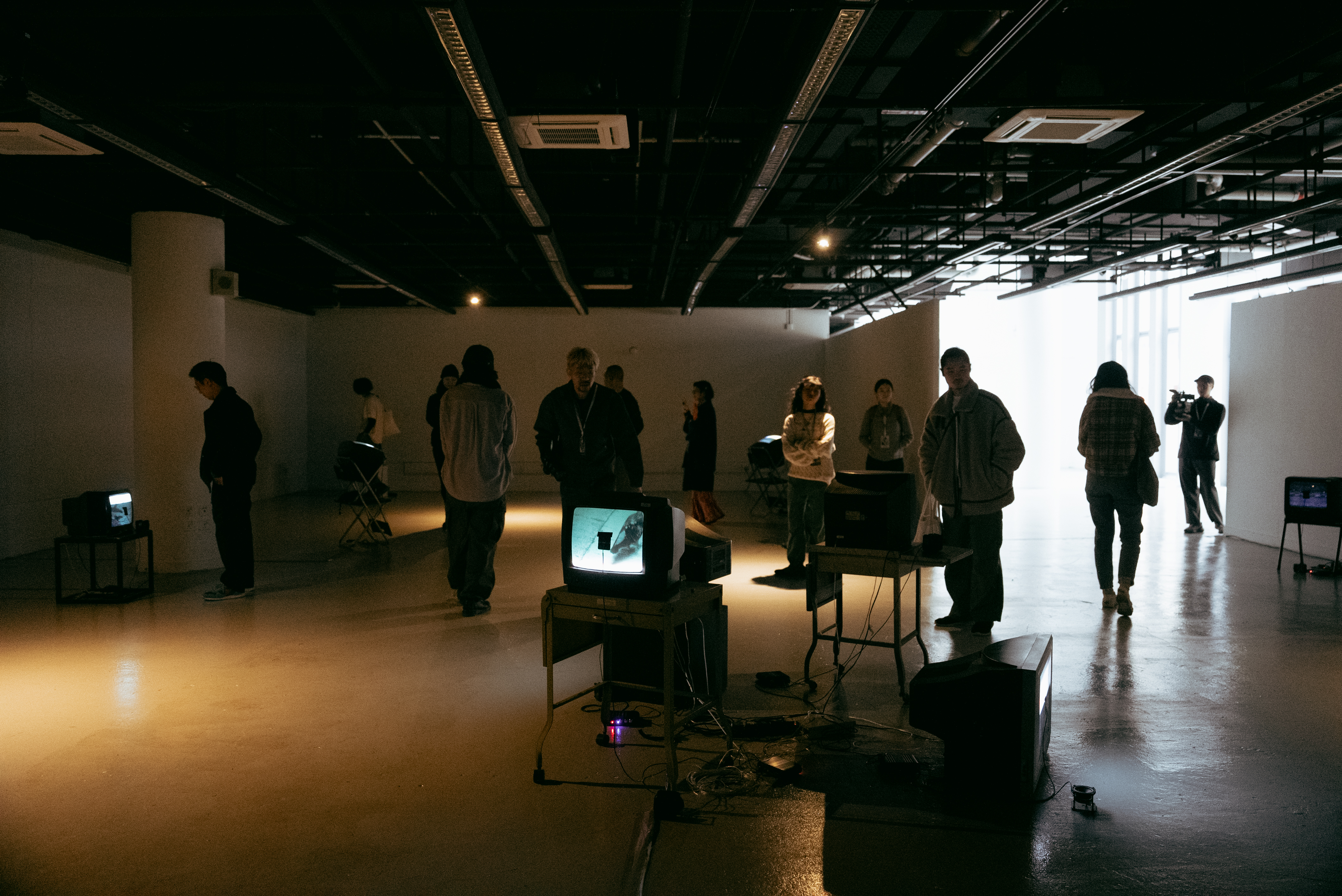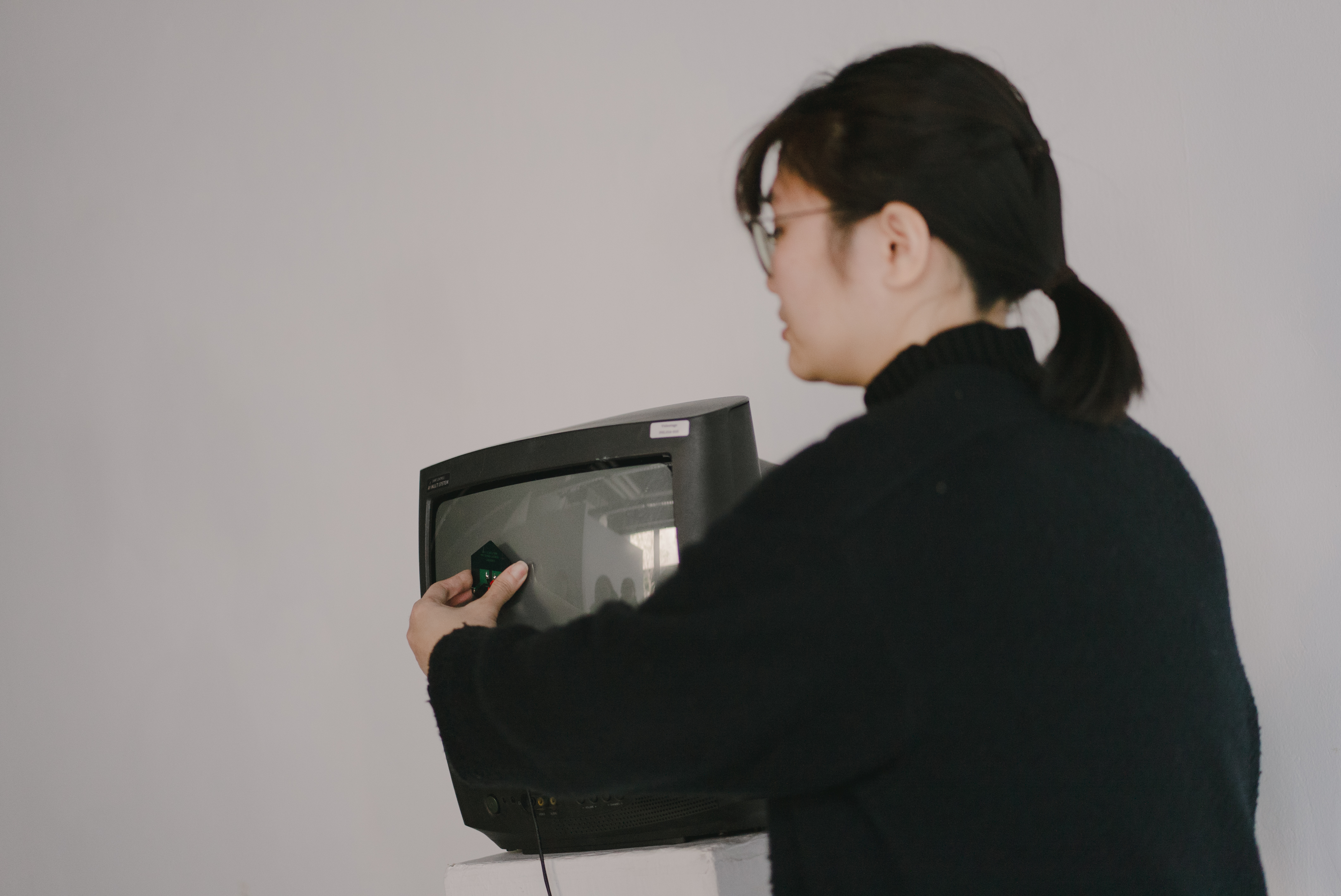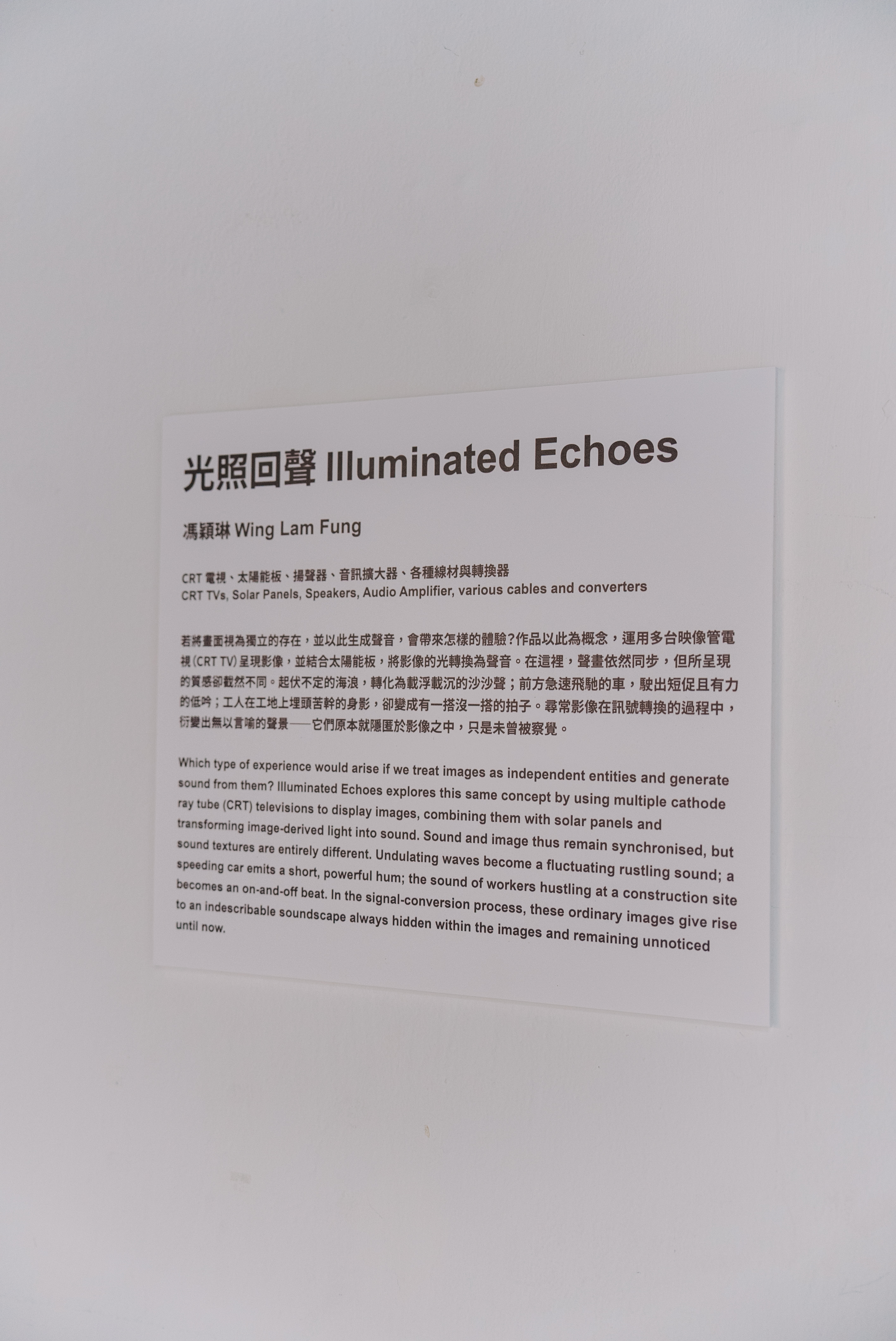 若將畫面視為獨立的存在,並以此生成聲音,會帶來怎樣的體驗?作品以此為概念,運用多台映像管電視(CRT TV)呈現影像,並結合太陽能板,將影像的光轉換為聲音。在這裡,聲畫依然同步,但所呈現的質感卻截然不同。起伏不定的海浪,轉化為載浮載沉的沙沙聲;前方急速飛馳的車,駛出短促且有力的低吟;工人在工地上埋頭苦幹的身影,卻變成有一搭沒一搭的拍子。尋常影像在訊號轉換的過程中,衍變出無以言喻的聲景——它們原本就隱匿於影像之中,只是未曾被察覺。